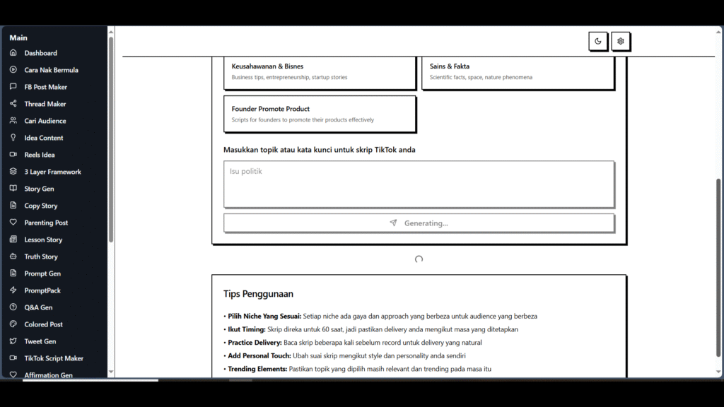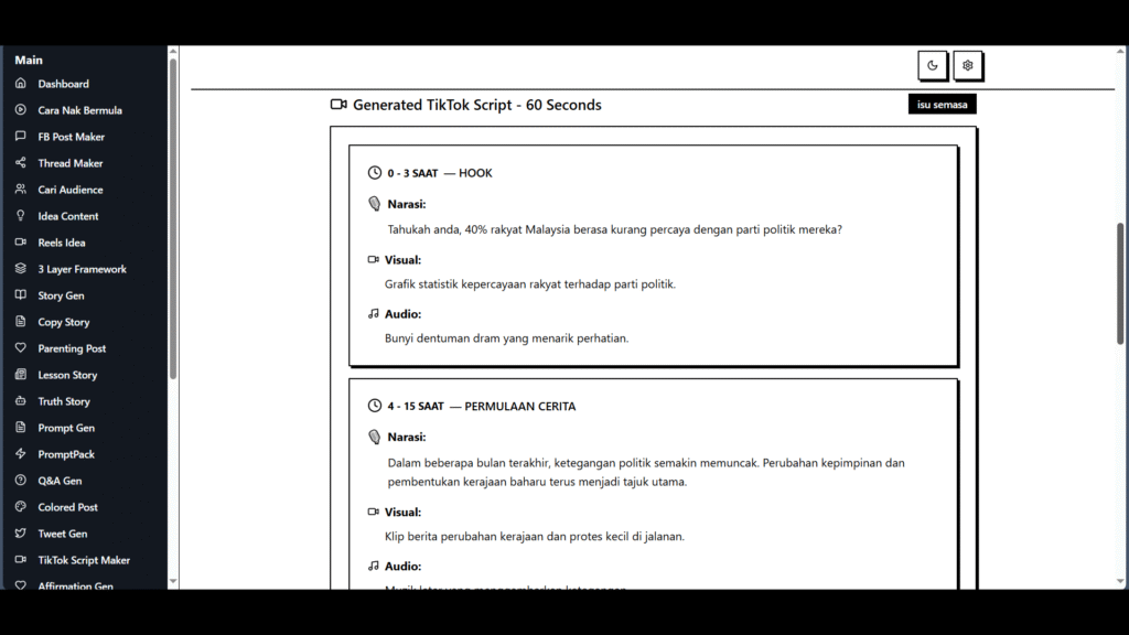 Prompt AI yang di-tuning untuk Bahasa Malaysia: gaya santai, rojak, dan references yang relevan untuk TikTok, Facebook, dan X.